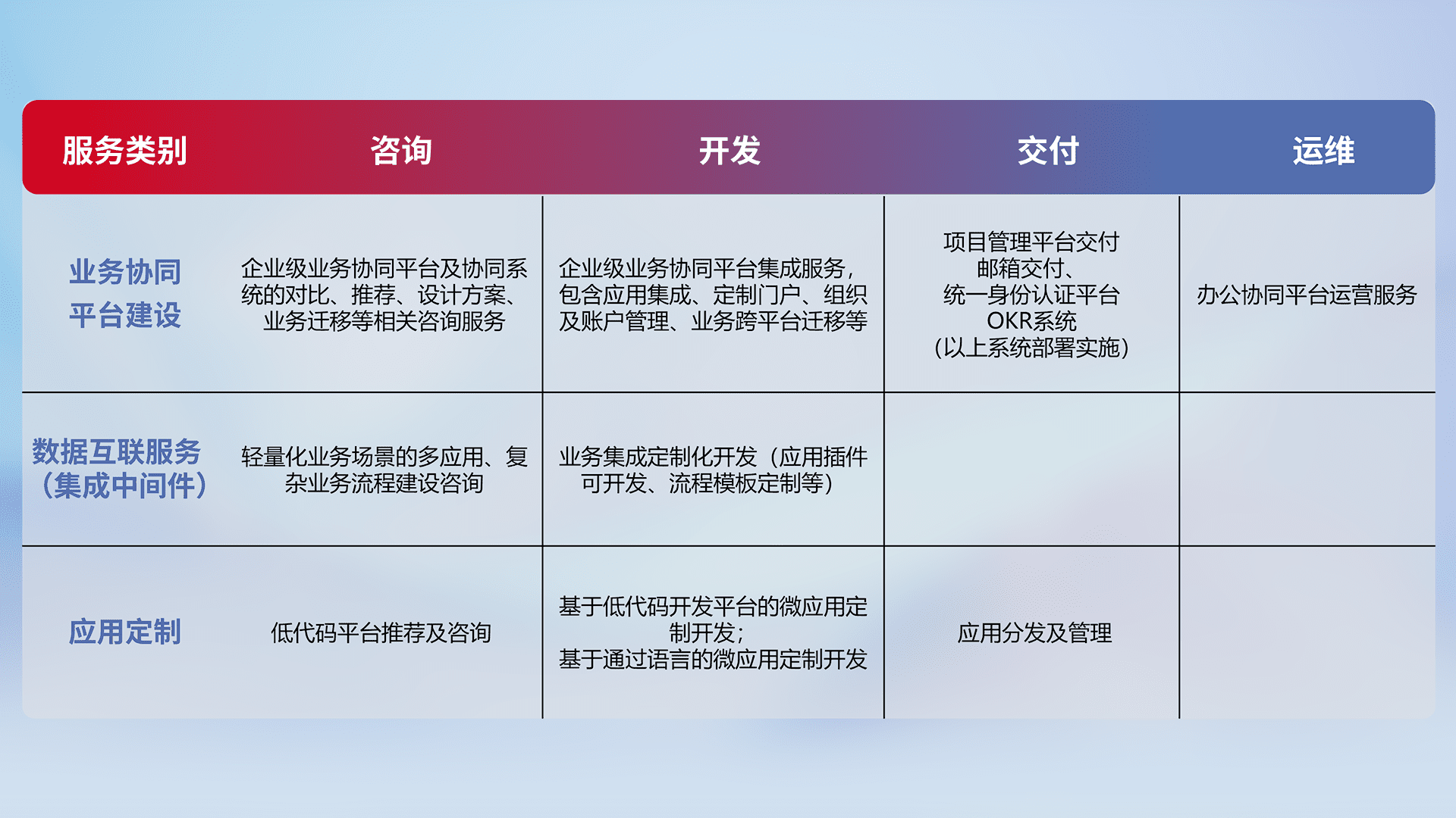 针对钉钉、、、企微、、、、IDaas等平台级产品提供产品的规划、、、方案、、、交付、、、定制化开发等服务,,,,实现如统一协同办公、、、、智能客户服务、、混合会议管理、、、、智能数据查询、、等业务场景,,,实现数字化转型。。。。