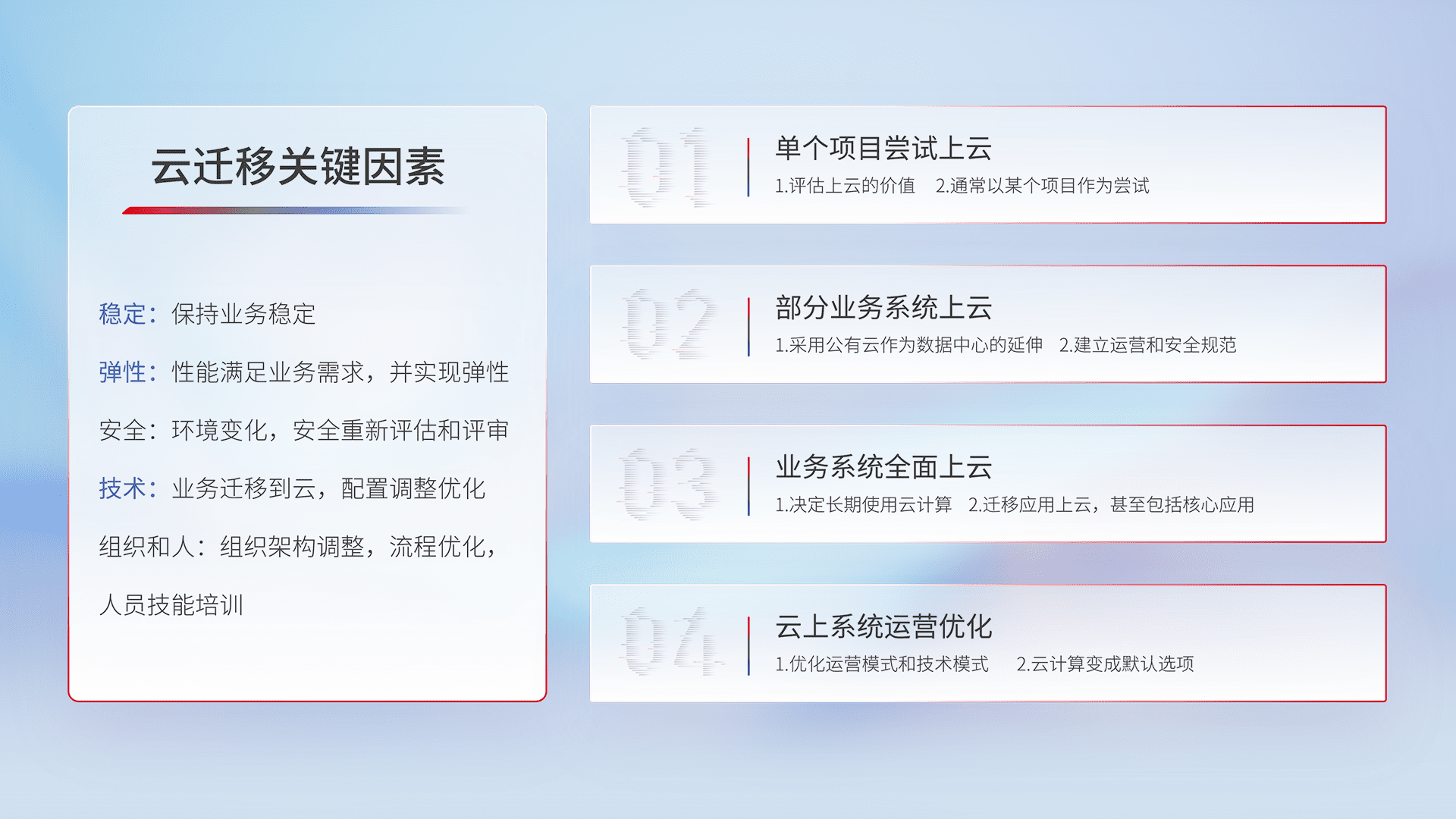 结合实际业务,,从规划设计、、云平台选型、、、、云原生改造、、、、数据迁移、、、、集成交付,,,迁移全过程为客户识别最佳上云路径,,,,做好风险识别管理,,设计网络架构、、身份权限、、安全审计合规、、操作审计、、日志审计、、、监控告警策略、、、、多站点容灾设计等,,,对云上基础设施进行整体规划,,,提升IT治理水平,,,,以满足弹性、、、高可用、、、、高性能的需求。。